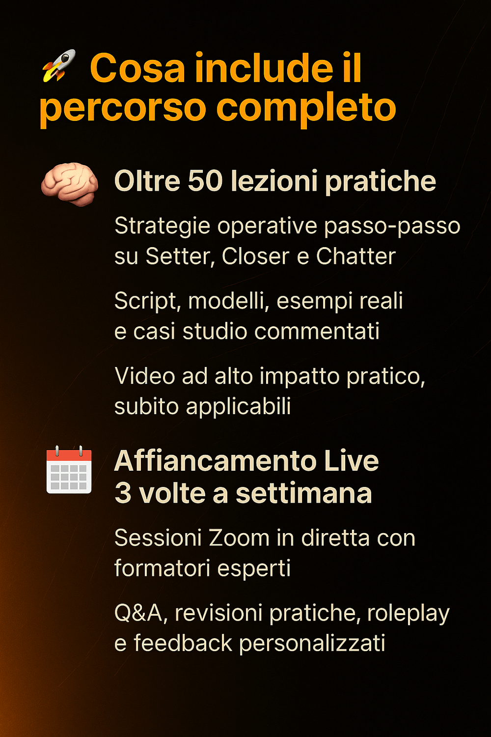 Ti seguiamo passo dopo passo per migliorare le tue abilità comunicative, gestire le obiezioni, e prepararti al lavoro vero.