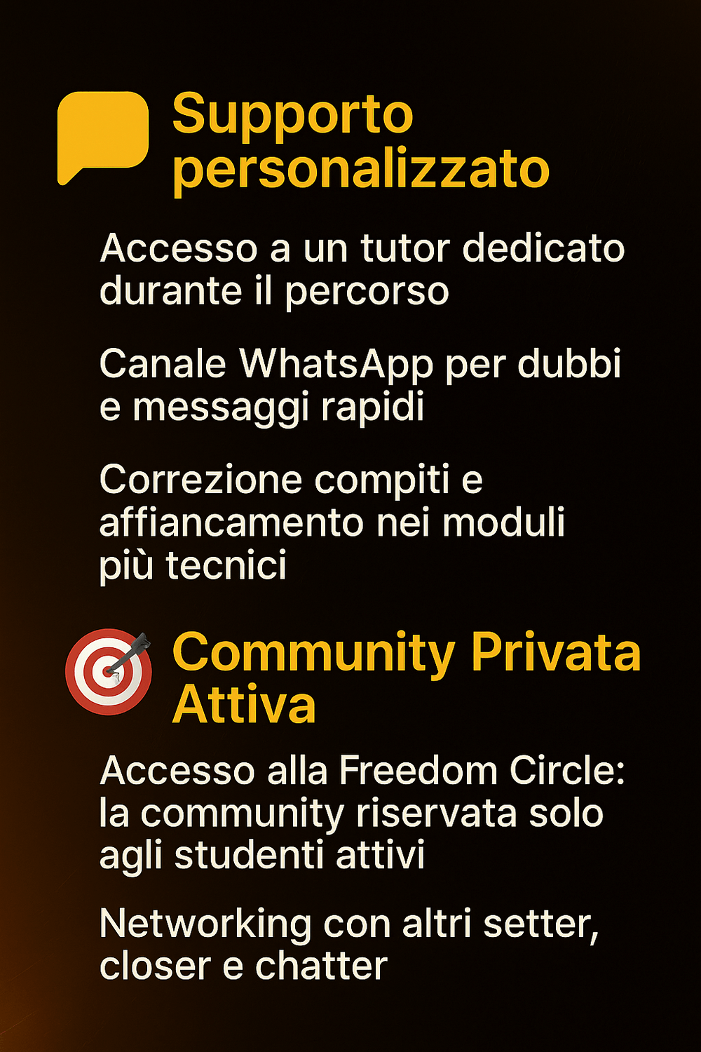 🎯 Hai accesso a supporto costante via call, messaggi o sessioni live.